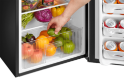 The separate freezer compartment gives you plenty of space to store your frozen dinners, ice cream, and more. The can dispenser and two-liter bottle rack free up shelf space and make your favorite drinks easily accessible. The stylish stainless steel look will suit all styles of decor and the interior light makes it easy to find your favorite treats. Use the mini-fridge in your den, garage, office, or dorm room, and it can easily fit in a tight corner or another out-of-the-way place. Easily set the internal temperature according to your needs, and simply adjust the leg height as this compact cooler fits perfectly in any kitchen.