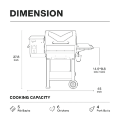 - Large cooking area and hopper capacity – 484 sq. in. Main rack + 216 sq. in. insulation rack, totaling 700 sq. in. Ideal for a large 3-12 group party. The whopping 25.8 LBS hopper capacity is ideal for continuous smoking.