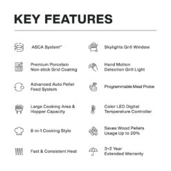 | Grill/Smoker Features | Automatic Auger, Automatic Shut-Off, Heat Thermometer, Locking Lid/Door, Pellet Purge System, Removable Ash Catcher, Storage Rack, Tool Holder, Warming Rack | Grill/Smoker Fuel Type | Pellet |