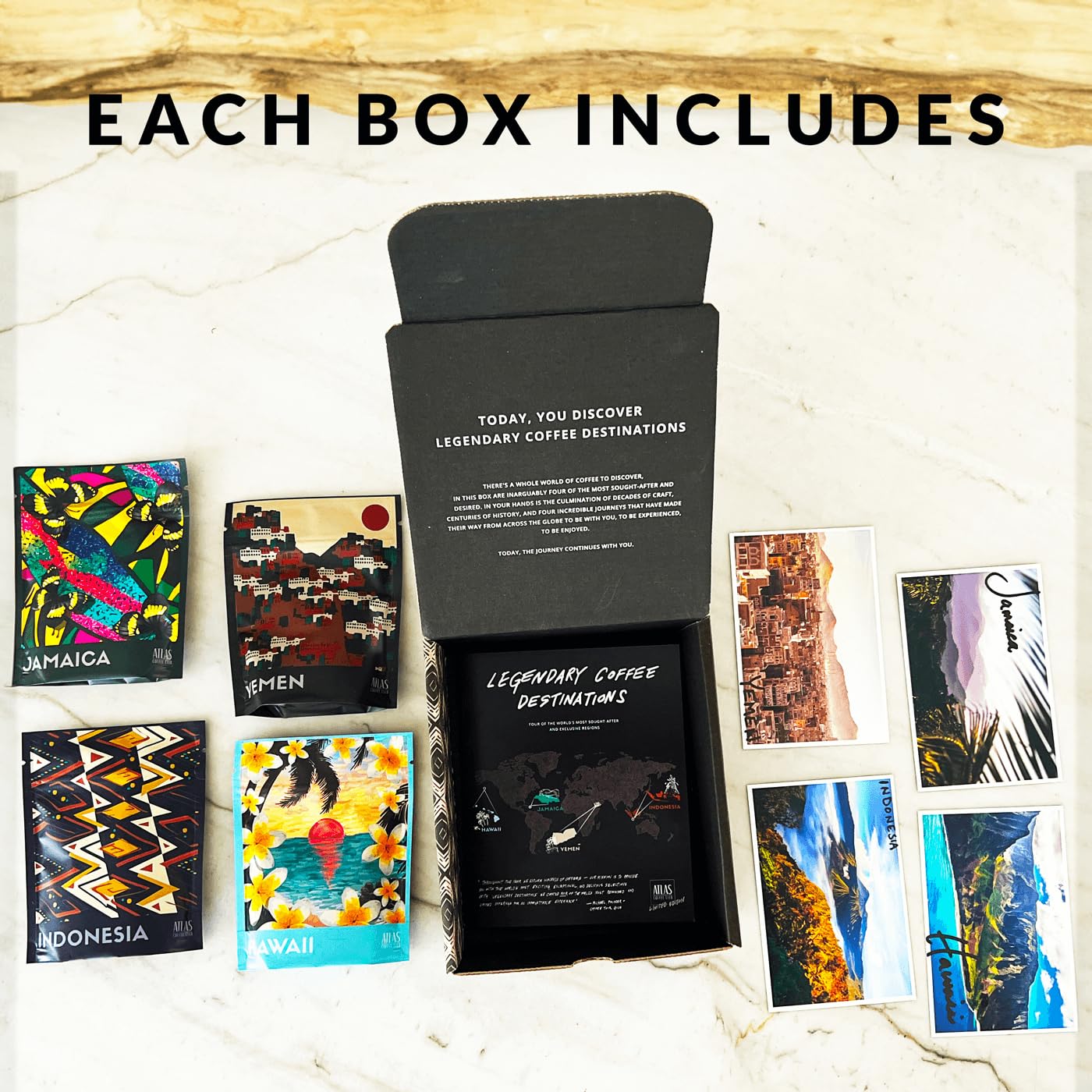 - DISCOVER RARE COFFEES: Consider us your coffee tour guides! Our sampler box includes 4, 1.8-ounce bags of the specialty coffee from Jamaica Blue Mountain, Yemen, Hawaii, and Indonesia. As a bonus, we include picturesque post cards from each country and tasting note cards for each roast!