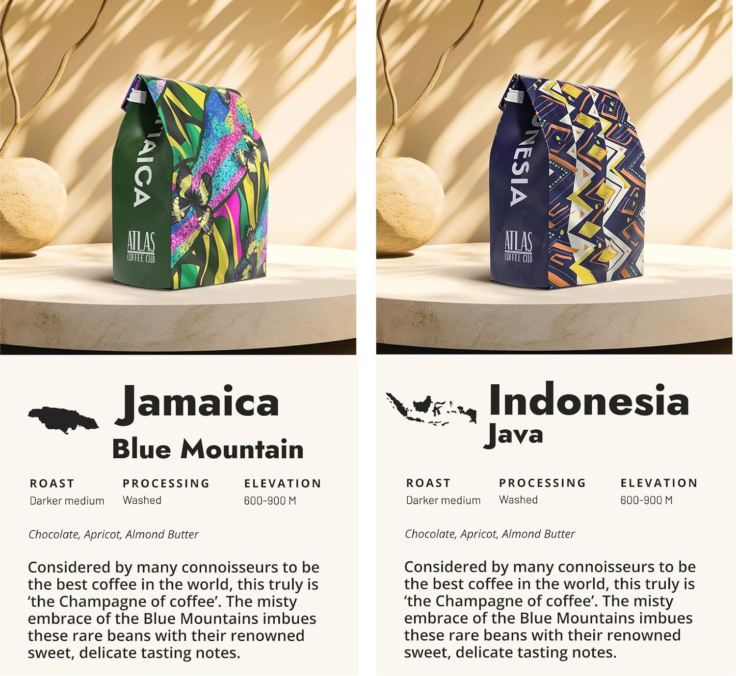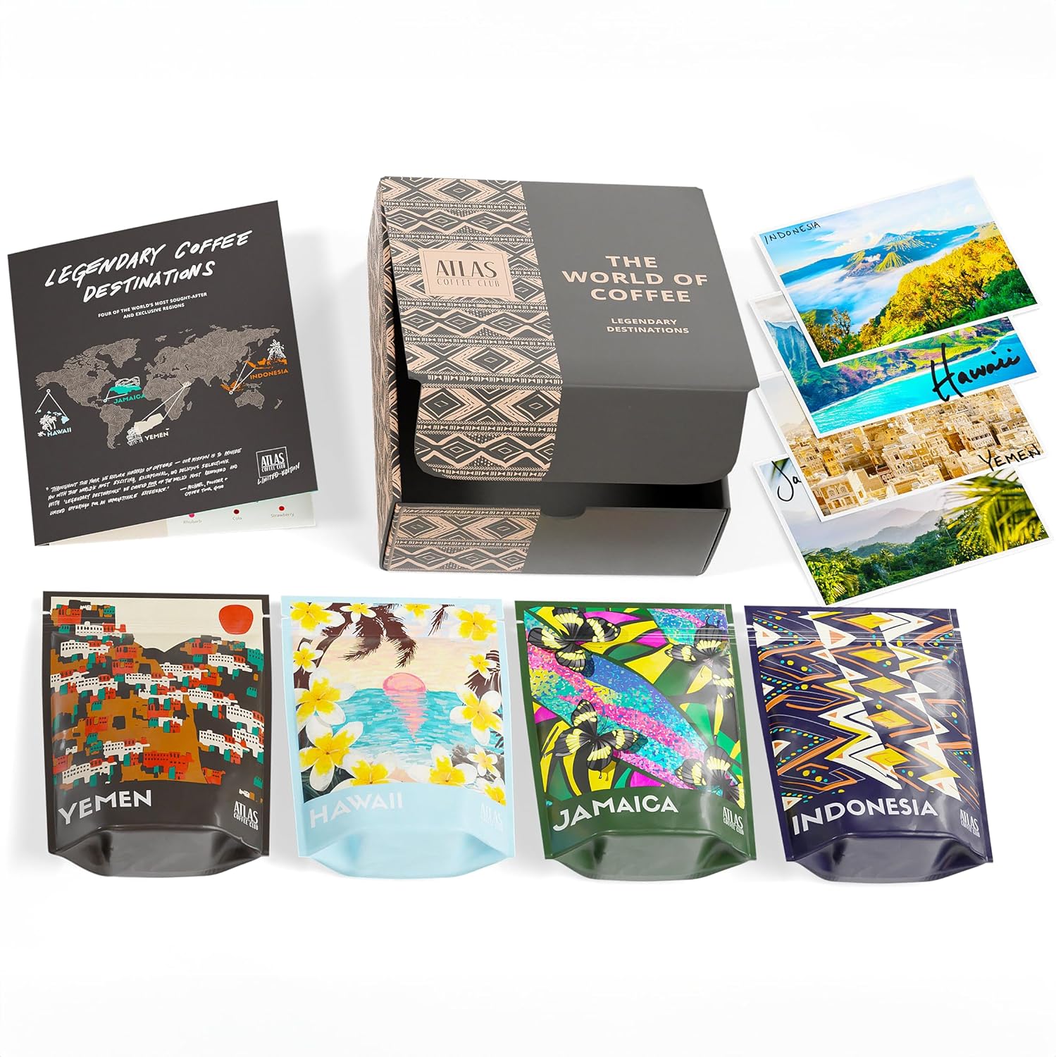 Atlas Coffee Club Rare Coffee Sampler, Gift Set for Him and Her, 4-Pack Variety Box of the World’s Most Unique Gourmet Single Origin Coffees Including Jamaica Blue Mountain, Whole Bean