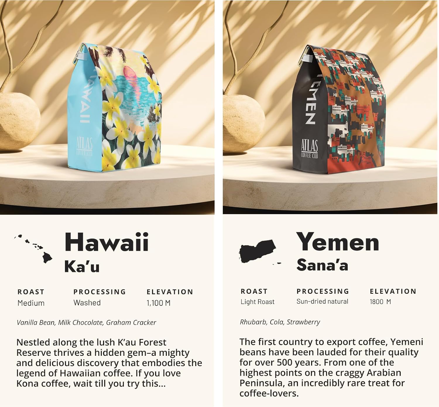 Atlas Coffee Club was founded to tell the story of coffee from around the world. Exploring and curating coffees from countries around the world, our Coffee World Tour gift set is an exciting journey of exotic discovery, highlighting the regional differences in every cup. Curating only the finest coffee, we roast each batch to accentuate tasting profiles distinctive to their native growing region to tell the story of the coffee from that country. Made to order to guarantee freshness, our Coffee World Tour gift set is the ultimate opportunity for delicious coffee discovery and global variety.