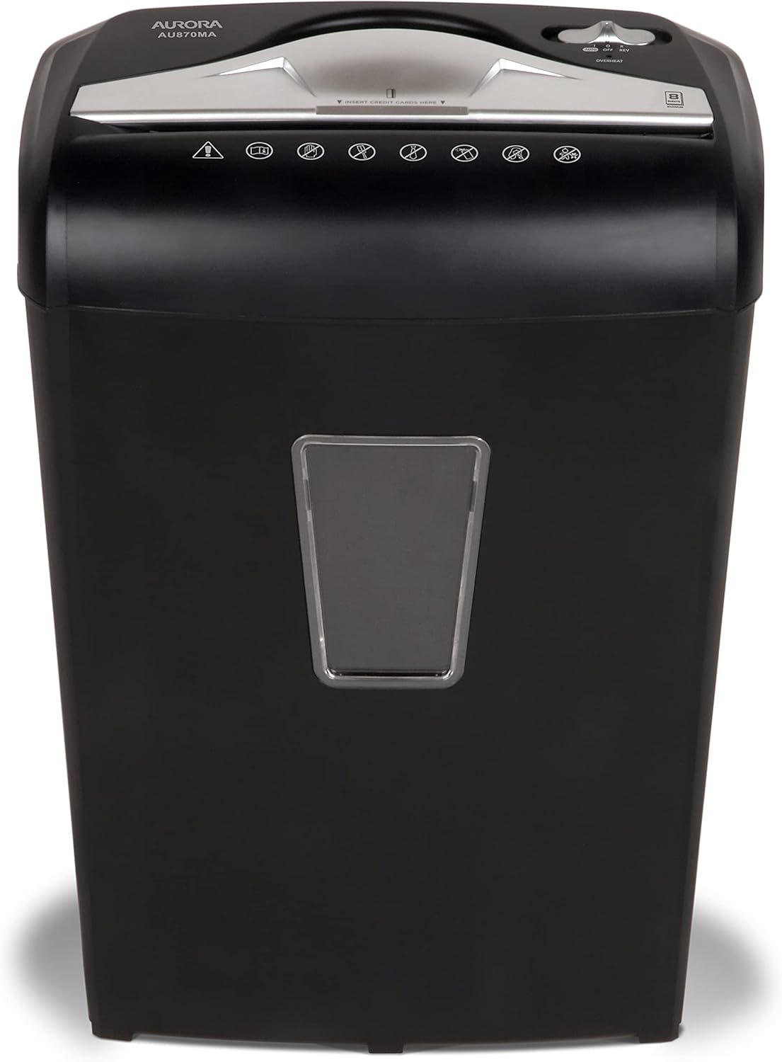 The Aurora AU870MA 8-Sheet micro cut paper/ credit card shredder with basket is the perfect home and small office device to help keep you safe from identity theft. The AU870MA accepts up to eight sheets of paper at a time and shreds them into 5/32 x 15/32 inches pieces. In addition to paper, the AU870MA shreds credit cards, keeping vital information from falling into the wrong hands. The throat of the shredder is 8.7 inches wide and allows continuous shredding for 5 minutes.