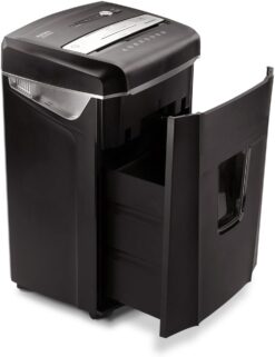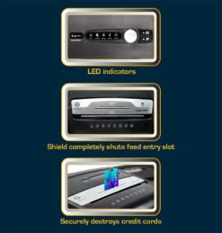 10 sheet micro shred paper shredder with 5 gallon pullout basket. Advanced Jam Free Technology eliminates paper jams The jam free sensor detects over capacity and shredding will not start to prevent paper jams The shred size of 5/32″ x 15/32″ has a continues shred of 12 minutes on and 45 off. The small particles reduce the frequency of having to empty the basket less often. The shredder also features Shred Safe, a safety feature which turns the shredder off upon forced entry by a foreign object. Also capable of shredding CD’s, Dad’s(one at a time) individual credit cards ,staples and paper clips. LED indicators Standby(power)/ Overheat/Overload/Door Open/Jam Free.