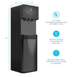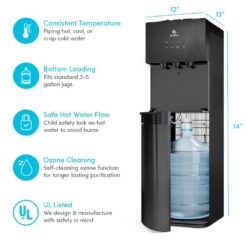 - Bottom loading: our water cooler is bottom loading to eliminate the strain of lifting, reduce spills and is suitable for 3 Gal. – 5 Gal. water bottles (bottle not included)
