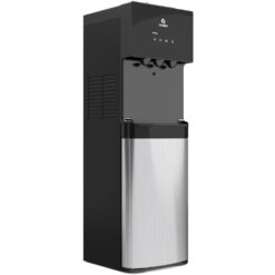 The Avalon 3 Temperature Bottom Loading Water Cooler with Child Safety Lock is made with an innovative stainless steel body. It offers a choice of 3 water temperatures. The easy-to-use push button spouts make it so much more convenient to use. Simply press the temperature button of choice and allow the water to flow from the given spout. The machines highly efficient compressor makes the cold water crisp and ice cold at approximately 47°F without the need of adding ice cubes to your drink. The hot faucet is hot enough to cook one’s tea or coffee or any other steaming hot beverage at approximately 185°F. Due to the extremely hot water, we’ve added a child safety lock on the hot water faucet. We have incorporated a nightlight that can be switched on from the back of the unit. This will make filling up your cup at night so much more simple and easy. The dispensing area is 12x3x10 in. with 9 in. of space below the spouts. This will accommodate most large cups or bottles. There is a removable drip tray at the bottom of the dispensing area to catch any drips or spills. This water cooler is bottom loading with a cabinet to hold 3 or 5 Gal. bottles. The water is pumped from the bottle through the machine. There is also an empty-bottle indicator that will light up when the bottle needs to be replaced. The water cooler is UL listed and complies with all standards of ENERGY STAR. The unit dimensions are 41x12x13 in.