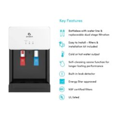 Have cold or hot water when you need it with this Countertop Self Cleaning Touchless Bottle less Water Cooler Dispenser, Hot/Cold Water, NSF/UL/Energy Star, White. It features certain safety measures that make it a great fit for your home, including a child safety lock on the hot water faucet. The filter removes harmful contaminants from your water. By pressing a switch, you can activate the self-cleaning feature.