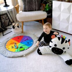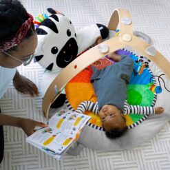 The Baby Einstein Zen’s Activity Milestones Plush Gym supports baby’s first year of development through multisensory play and included play guide for parent. With bright colors, textures, and multiple sensory features, baby will love to explore and learn colors, numbers, shapes, and more in this comfortable, milestone-focused play space. A sleek, wooden toy bar features 5 removable toys including colorful rings, shape discs, numbered flashcards, a bead chaser, and a baby-safe mirror. Zen the Zebra prop pillow gives baby extra support during tummy time and features tags for tactile discovery and can detach for on-the-go play. Light-up, take-along color wheel toy teaches colors in 4 languages (English, Spanish, French, and German) and features crinkle sounds, lights, and music. Mat is machine-washable for easy cleaning and toy bar collapses for easy storage and travel. Assembled dimensions: 39.4 x 31.5 x 19.5 inches. 3 AAA batteries (not included).