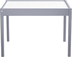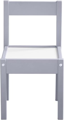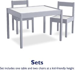 The sturdy wood construction comes in a cool two-tone gray and white finished table and chair…