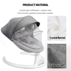 The electric swing has 5 speeds motion which can fit your baby’s preference to soothe them quickly. The two toys hanging on the swing can attract your baby to calm down. While you need a rest, our bluetooth enabled control and remote can satisfy you. Whether you sit on a couch or lay on a bed, you can control the motion, music, and time of the swing, giving you a chance to be lazy.