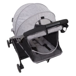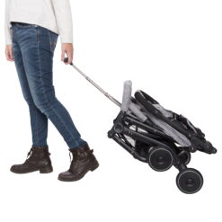 The lightweight and durable Jetaway Plus Compact Stroller from Baby Trend® is the perfect companion when you’re on the go. The telescoping handle allows you to roll the folded stroller to your next destination for easy transport. The 5-point safety harness, multi-position reclining seat and adjustable leg support keeps your little one secure and comfortable. The ratcheting canopy has a rear roll-up airflow panel and a peek-a-boo window. The easy grip handle has a removable cup holder and the large storage basket keeps necessities nearby. The stroller features dual front wheels to provide a smooth ride. The Jetaway Plus folds compact and fits in the included tote bag for easy transport. It accommodates children up to 45 pounds.