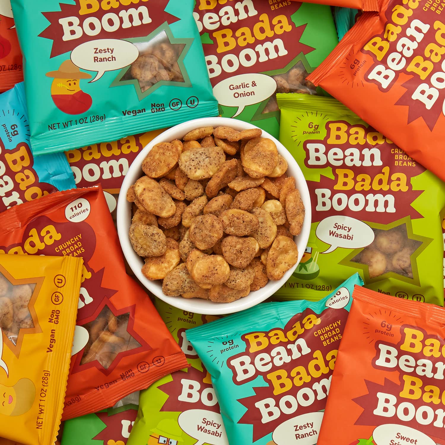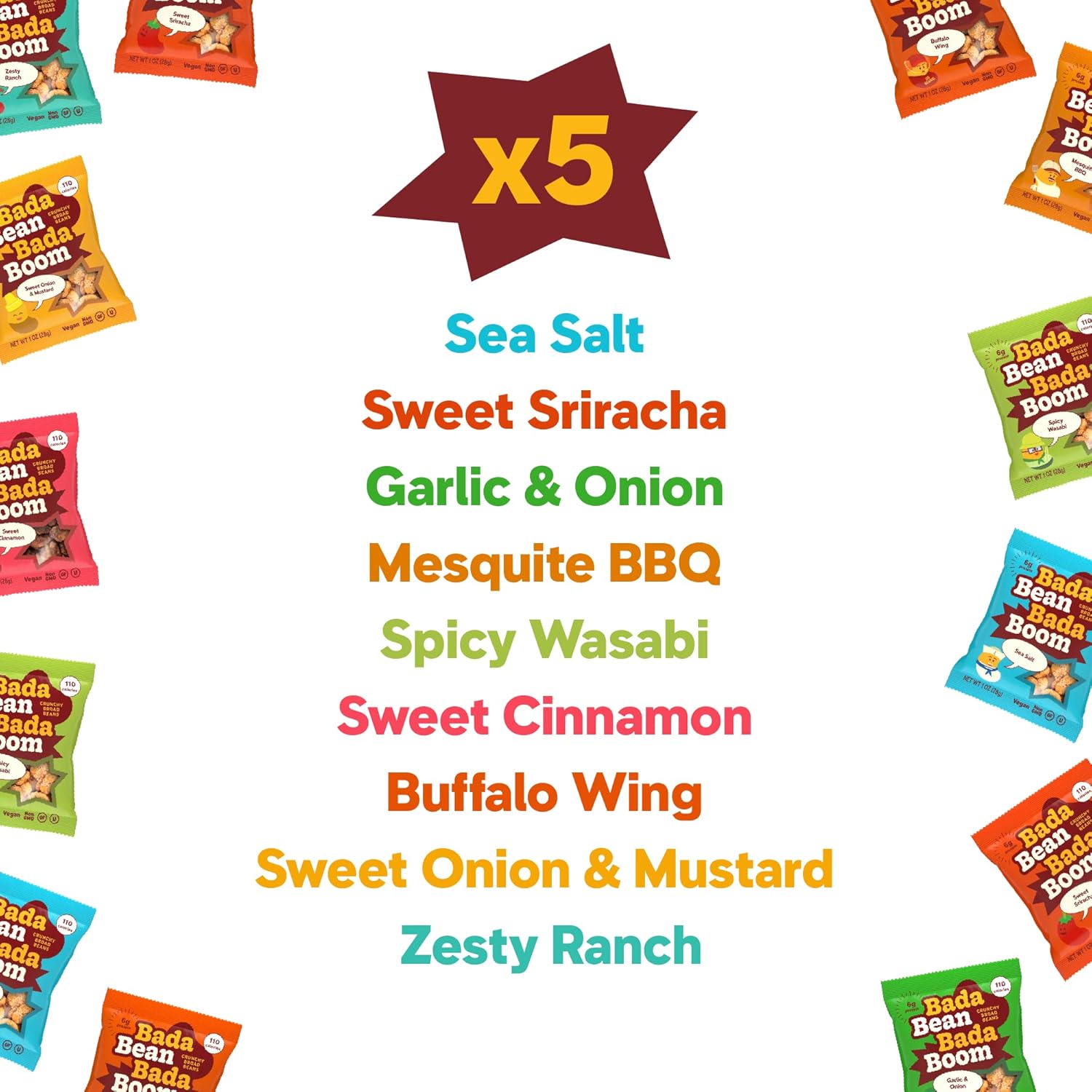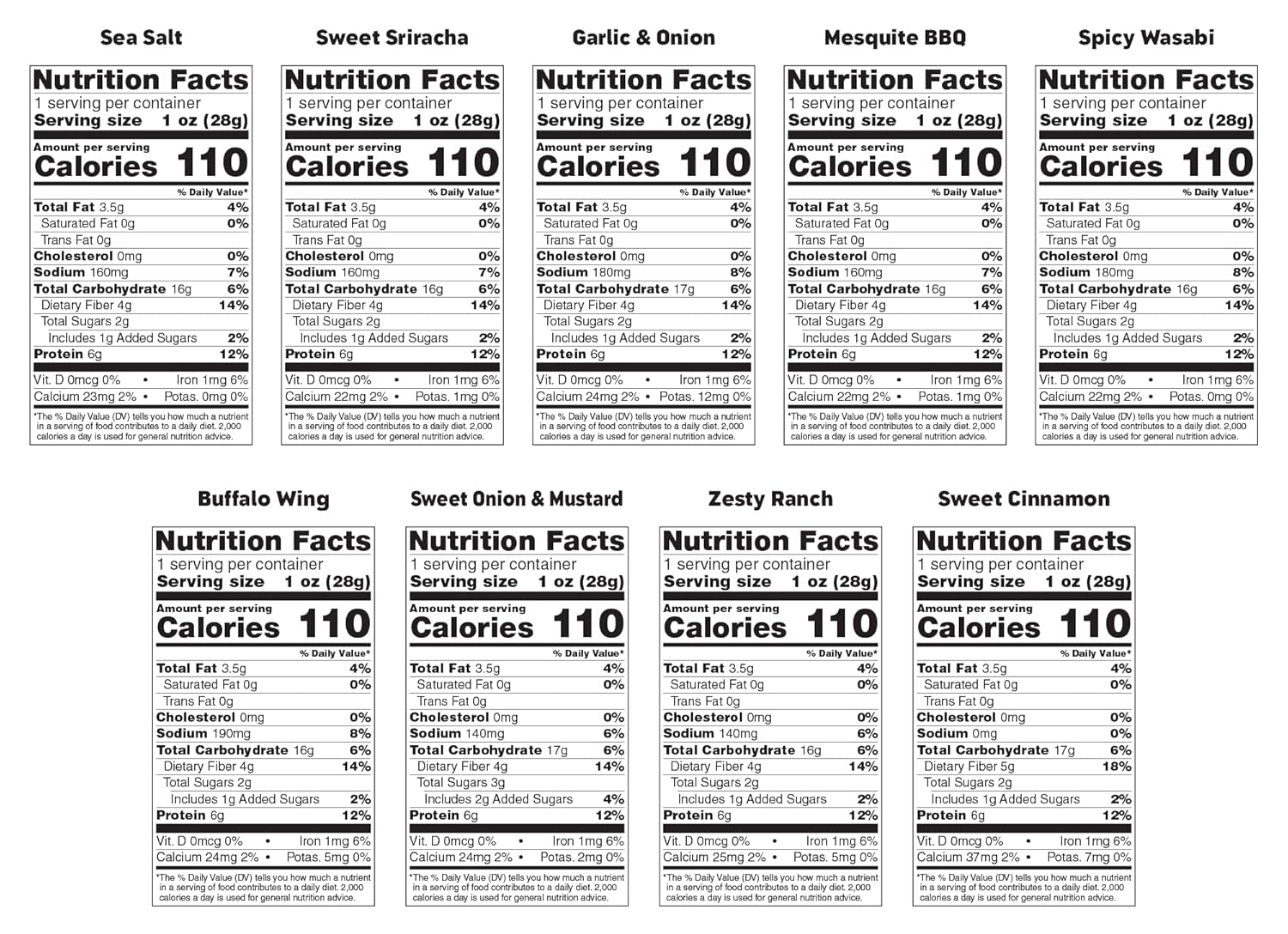 Sea Salt: Broad beans (fava beans), sunflower oil, rice flour, cane sugar, maltodextrin, sea salt. Sweet Sriracha: Broad beans (fava beans), sunflower oil, rice flour, seasoning (cane sugar, maltodextrin, garlic, chili powder, onion, yeast extract, citric acid, paprika extract, malic acid, stevia), sea salt. Garlic & Onion: Broad beans (fava beans), sunflower oil, rice flour, cane sugar, garlic, onion, maltodextrin, sea salt. Mesquite BBQ: Broad beans (fava beans), sunflower oil, rice flour, seasoning (cane sugar, maltodextrin, garlic, tomato powder, onion, chili powder, yeast extract, paprika extract, citric acid, natural smoke flavor, stevia), sea salt. Spicy Wasabi: Broad beans (fava beans), sunflower oil, rice flour, cane sugar, maltodextrin, wasabi mustard oil, sea salt. Buffalo Wing: Broad beans (fava beans), sunflower oil, rice flour, seasoning (cayenne pepper, distilled vinegar, garlic, maltodextrin, yeast extract, cane sugar, citric acid, paprika extract, natural non dairy butter flavor), salt. Sweet Onion & Mustard: Broad beans (fava beans), sunflower oil, rice flour, seasoning (cane sugar, maltodextrin, corn starch, white distilled vinegar, mustard seed, onion, citric acid, safflower oil, turmeric extract, natural flavor, stevia, yeast extract), salt. Zesty Ranch: Broad beans (fava beans), sunflower oil, rice flour, seasoning (cane sugar, maltodextrin, yeast extract, onion, garlic, natural non-dairy butter flavor, spices, tomato powder, lactic acid, white distilled vinegar, citric acid), sea salt. Sweet Cinnamon: Broad beans (fava beans), sunflower oil, rice flour, cinnamon, cane sugar, maltodextrin, stevia.