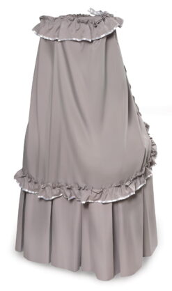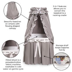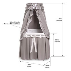 Badger Basket’s Majesty Baby Bassinet with Canopy is a complete bassinet with bedding (liner/skirt, fitted sheet, canopy, foam pad). It features a convenient storage basket hidden beneath the skirt and the wheels can be flipped up to rock the bassinet like a cradle. The bedding can be removed from the metal frame for machine washing. Overall unit measures 30.25 inches L x 16 inches W x 53 inches H with the wheels down (51.5 inches with the wheels up). Adult assembly required.