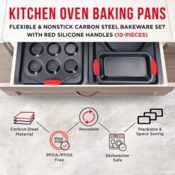 Baking Set – 10 Piece Kitchen Oven Bakeware Set – Deluxe Non-Stick Blue Coating Inside and Outside – Carbon Steel – Red Silicone Handles – PFOA PFOS and PTFE Free by Bakken,Black