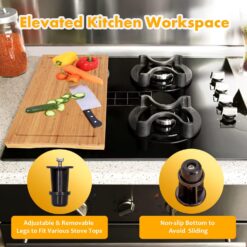 - 【Elevated Workspace Saver】With adjustable & removable legs, this raised countertop chopping board can perfectly fit your stovetop in any size. . It’s also the perfect carving board for tall people, no more bending over. Also, these easily assemble feet has an anti-slip silica gel bottom to keep the bamboo board more stable