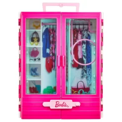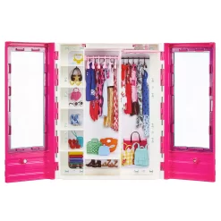 Barbie® and Ken® dolls are always on the go, with a closet and convertible, they can move in minutes! Open the translucent doors of the pink closet to discover storage space and an extendable garment rack with two hangers. Plus, the handle on top makes it easy to take with you.