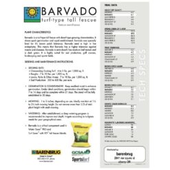 Barvado tall fescue was developed by breeders and given the breeder code “EBP” meaning “Enhanced Brown Patch”. It was bred from plants that survived a brown patch epidemic. Barvado combines this excellent brown patch tolerance with excellent turf quality. Barvado is a dark green variety and is highly ranked in NTEP trials. It is a semi dwarf variety and has medium leaf texture. Barvado has a high live endophyte content as well. These endophytes give Barvado improved disease and insect resistance. Barvado is highly suited for sod production, golf courses and sports fields.