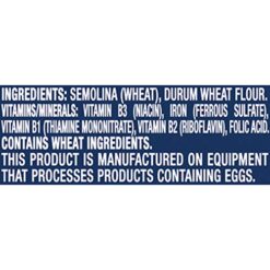 Semolina (wheat), durum flour, niacin, iron (ferrous sulfate), thiamin mononitrate, riboflavin, folic acid. contains wheat ingredients. this product is manufactured on equipment that processes products containing eggs.