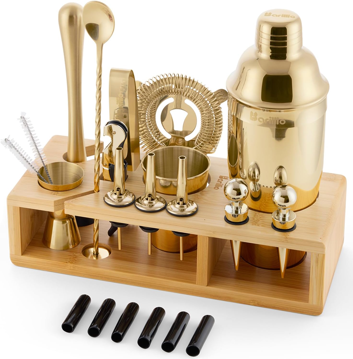 Barillio Gold Bartender Kit – Stainless-Steel Cocktail Shaker Set w/Bamboo Stand – Mixology Bar Tools w/Drink Shaker, Mixer Spoon and Muddler for Cocktails – Home Bar Accessories – 23-Pc Bar Set