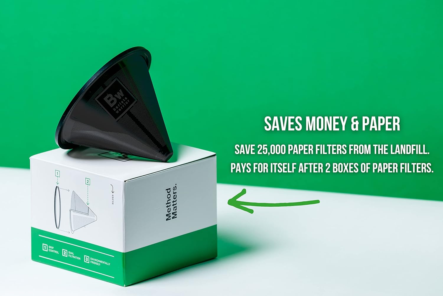 - REUSABLE COFFEE FILTER | SAVES MONEY – Each purchase saves 25,000 paper filters from heading to the landfill. By making the decision to switch to a metal cone coffee filter today you’re helping save our planet tomorrow. Save hundreds of dollars by switching to our metal filter, no more wasting money each month on paper filters.