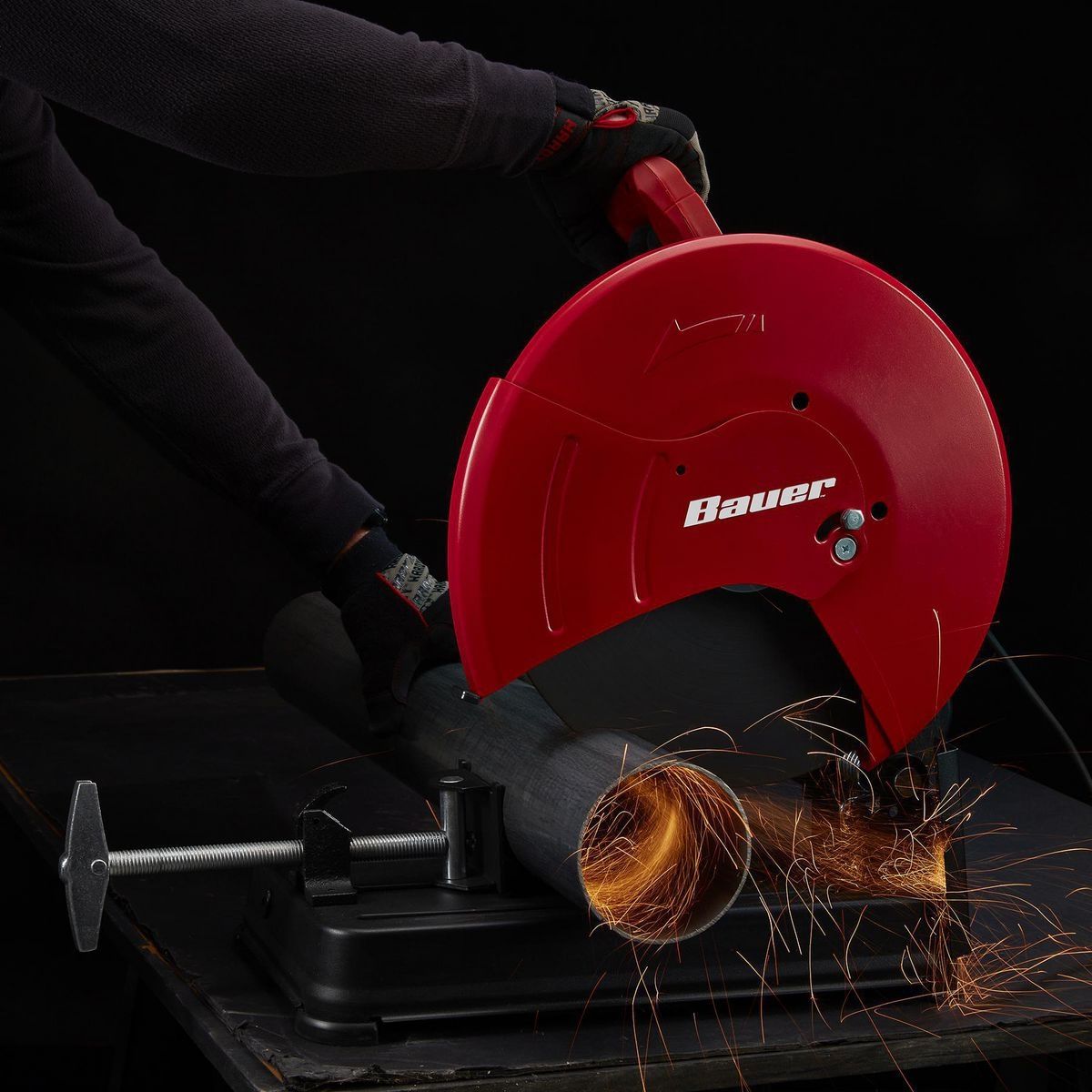 The BAUER™ 14 in. Abrasive Cut-Off Saw features a high performance 15 amp, 3.8 HP motor to slice through metal with ease. With a blade speed of 4200 RPM , this saw quickly cuts drywall track, angle iron, conduit, pipe, channels, tubing and rebar. The quick-adjust vice and depth stop ensure accurate cuts every time. This saw is constructed with an all-metal gear box, an all ball bearing motor, and a rugged steel base for long life and extreme durability. The long-reach 74 in. power cord provides plenty of jobsite mobility.