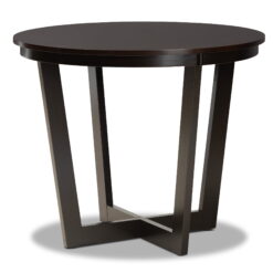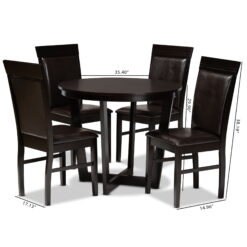 Unique, eye-catching design equipped with modern comfort create the wonderful Irma dining set. Made in Malaysia, the Irma is constructed from sturdy wood and is comprised of four chairs and one circular table. Foam-padded seats underneath smooth faux leather provide plush comfort while the circular tabletop allows ample elbow room for each member of the table. Requiring assembly, the dark color scheme of the Irma allows for easy integration with modern home decor. A set that radiates classic style, the Irma dining set is a fantastic addition to enhance any dining space. Chair Dimensions: 38.19″ High x 17.13″ Wide x 14.96″ Deep; Seating Dimensions: 18.5″ High (from Floor) x 17.13″ Wide x 15″ Deep; Back: 19.69″ High; Legs: 16.54″ High; Table Dimensions: 29.9″ high x 35.4″ wide x 35.4″ deep; Legs: 29.1″ high;