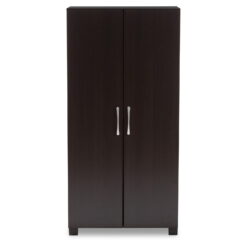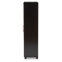 Function and style combine to make the Baxton Studio Marine 2 Door Entryway Shoe Storage Cabinet. This storage cabinet is made of engineered wood in a rich wenge finish, and there are six shelves inside to store twelve pairs of shoes. Two doors conceal the shelves, and each door has a silver PVC handle. Square PVC legs in a dark finish add to the contemporary style of the cabinet. Cut-outs in the back of the cabinet provide ventilation for your shoes. Use this cabinet in your entryway or bedroom to supplement a small closet. Some assembly required.