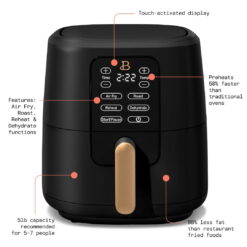 Easy meals for busy weeknights. Air fry, roast, reheat or dehydrate your favorite meals with the Beautiful 6QT Digital Air Fryer with Touch Activated Display. Thoughtfully designed with sleek touch-activated illumination and our signature gold accents, the Beautiful Air Fryer preheats food up to 50% faster than a traditional oven with a 5lb food capacity ideal for serving 5-7 people. Created by Drew Barrymore, Beautiful Kitchenwareâ„¢ combines elegant design, contemporary colors and modern silhouettes for high-performance appliances that look beautiful on your kitchen counter.