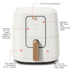 Easy meals for busy weeknights. Air fry, roast, reheat or dehydrate your favorite meals with the Beautiful 6QT Digital Air Fryer with Touch Activated Display. Thoughtfully designed with sleek touch-activated illumination and our signature gold accents, the Beautiful Air Fryer preheats food up to 50% faster than a traditional oven with a 5lb food capacity ideal for serving 5-7 people. Created by Drew Barrymore, Beautiful Kitchenwareâ„¢ combines elegant design, contemporary colors and modern silhouettes for high-performance appliances that look beautiful on your kitchen counter.