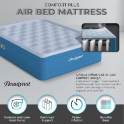 Supportive and durable, the Beautyrest Comfort Plus offers less motion transfer with its offset coil-in-coil comfort mattress design. The extra plush cooling mattress top, with Edge Support, will keep you sleeping peacefully night after night. This inflatable, portable bed provides anti-leak and stretch prevention due to the Polyfusion EverFirm fabric and the air-tight locking system of the built-in pump. The Comfort Plus inflates and deflates in just minutes for anytime, convenient comfort for you or your guests.