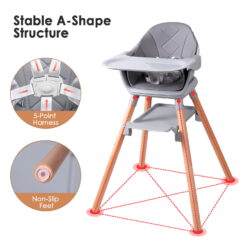 Color: gray Convertible Wooden Highchair Double Removable Tray 5-Point Harness PU Cushion