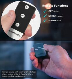 - AUTOMATIC ACTIVATION and REMOTE CONTROL: Our light is fully automatic, but it also comes with the convenience of a remote control with easy-to-use 1-touch buttons so you can control the mounted floodlight from the comfort of your bedroom or living room at night.