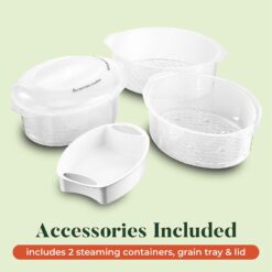 - ALL YOU NEED: A 3-tier design allows you to cook multiple items at once for quick & easy meal preparation—simply set the timer & watch it work! Includes 3 steaming containers, grain tray & lid which are all dishwasher safe. Also includes a BONUS 1L rice bowl!