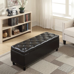 Lend your decor a classic look with this modern ottoman bench. It features plush upholstery with tufted button detailing for a decorative touch. The luxurious faux leather draping creates an upscale look that’s sure to elevate your decor to the next level. This ottoman blends a modern rectangular silhouette with glam styling, making it the perfect accent furniture for your living room. The classy dark brown upholstery showcases timeless elegance while retaining a clean and sophisticated look. Subtle stitching pattern and a row of shining nail head trim at the bottom of the piece add an alluring touch.