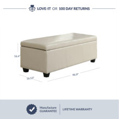 Looking to de-clutter the space with some extra storage? This ottoman is the perfect solution. It offers spacious storage, simply open its hinged lid to stash throw blankets, board games, out-of-season decorative pillows, and more. The interior space of this ottoman is both large and secure. The hinged safety stop ensures that once lifted, the lid will stay open until placed back. Easy to assemble with all hardware and instructions included as part of the package. Overall dimensions include 46.85″(W) x 16.54″(D) x 16.34″(H).