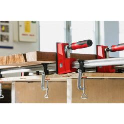 The BESSEY K-Body REVO has large parallel jaws designed to clamp at a nominal 90°. The K-Body REVO is rated at 1700 lbs. of clamping force and has a 3-3/4 in. throat depth. Also included as standard parts are 3 glue-resistant removable jaw pads, 2 rail protection pads and an end clip that helps to balance the clamp during glue-ups. The end clip and the rail protection pads have through holes for use with optional TK-6 hold-down clamps to temporarily affix the clamp to a workbench or other surface up to 2 in. thick. An ergonomic composite handle for better comfort and grip comes standard. Other accessories are available. All figures used for reference are nominal and not precise indicators.