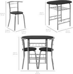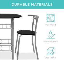 Best Choice Products 3-Piece Wooden Round Table & Chair Set for Kitchen, Dining Room, Compact Space w/Steel Frame, Built-in Wine Rack – Black/Silver