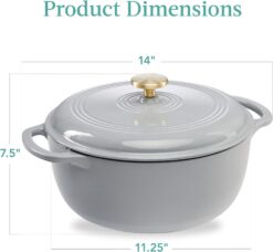 - ELEVATE YOUR KITCHEN: A clean, glossy finish makes this dutch oven both a nostalgic icon and a modern addition to any well-equipped kitchen; features a brushed metal handle (silver or gold) for an extra touch of style!; OVERALL DIMENSIONS: 14″(L) x 11.25″(W) x 7.5″(H); OVEN CAPACITY: 6 Qt.