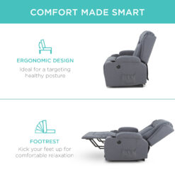 Enjoy dependable comfort in a recliner that does it all! Lifting functionality and an easy-to-reach button are just a small piece of what sets the chair apart from the rest, as easy recline and power lift functionality provides comfort and convenience for anyone in need of assistance. Relax with a massage + heat; incredibly soothing heat in the backrest pairs with seat & backrest massage points to promote ample comfort. Simply use the remote to set the timer and navigate 5 modes. Made with an anti-tipping base, 2 convenient side pockets, and a USB port to charge wireless devices, this chair also has 2 front pockets, 2 cupholders, and overstuffed armrests. Comfort is made smart through an ergonomic design ideal for targeting healthy posture and a footrest that allows you to kick your feet up for comfortable relaxation. For placement purposes, overall dimensions are 34.6 in. x 30.7 in. x 41 in., with a floor-to-seat height of 25.6 in. Fully reclined is a length of 64.6 in. and height of 33.5 in., and lifted is 58.7 in. tall.