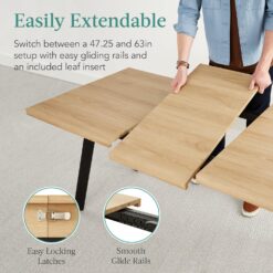 - EASILY EXTENDABLE: Pull the two sides of the table along the smooth gliding rails and insert the leaf extension to switch between a 47.25 and 63-inch setup