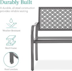 Best Choice Products Outdoor Bench 2-Person Metal Steel Benches Furniture for Garden, Patio, Porch, Entryway w/Geometric Backrest, 790lb Capacity – Gray
