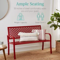 Best Choice Products Outdoor Bench 2-Person Metal Steel Benches Furniture for Garden, Patio, Porch, Entryway w/Geometric Backrest, 790lb Capacity – Rose Red