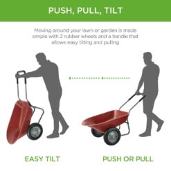 Make gardening easier with a convenient option for moving gravel, mulch, and more. For anything your yard requires, you can haul it all with this multipurpose cart that gets the job done without the hassle; easily push, pull, or tilt wood and soil. Moving around your lawn or garden is made simple with 2-rubber wheels and a handle that allows easy tilting and pulling. The cart’s handle is coated with an ergonomic rubber grip for a comfortable grip as you work. A durable construction includes a heavy-duty, powder-coated metal frame, durable plastic bin, and a 330 lbs. weight capacity. Plus, heavy-duty, all-terrain wheels provide a smooth ride on various surfaces; 14 in. wheels are made with all-terrain tread. Tip your wheelbarrow for easy storage in the garage until your next outdoor project. For storage purposes, measurements are 58 in. x 27.5 in. x 26 in.