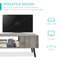 When it comes to coffee tables, form and function need to come together every time. That’s why this table is exactly right for you! This table gives you plenty of room to store magazines, books, coasters, remote controls, and more! Designed with a smooth material and an open design that makes for an easy-to-clean table you can wipe down in seconds. Use it as a coffee table or tv stand and entertainment center for your media consoles-there’s ample room in its 39in width (holds Up To 65″ TV). Even if you don’t need a storage piece, you can still enjoy a wood grain finish and an open design that lets you keep decorative pieces on display. Durable engineered wood makes a sturdy frame, strong enough to maintain a 110lbs weight capacity. This with angled pinewood legs keeps this table sturdy while a classic wood finish adds a refined look to any home.