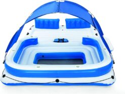- The floating island includes: removable sunshade, cooler bag, and heavy-duty repair patch