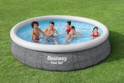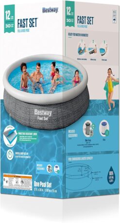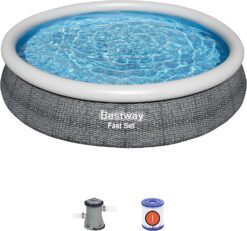 With this quick and easy Bestway® Fast Set™ Pool Set, you’ll be ready for a pool day in no time! The Fill & Rise set-up process is simple – just select a level surface, inflate the top ring and the pool will rise as it’s filled up with water. The sturdy DuraPlus™ liner is made out of an ultra-durable 3-layer material that is reinforced for strength and is 85% more puncture-resistant than PVC. The attractive liner also features a realistic rattan print that will bring a classy look and feel to your backyard. When the season’s over, storage is fast and simple. The water releases easily through the flow control drain valve, and then the pool can fold up for compact off-season storage. Also included with the set is a filter pump to help keep the water clean. This pool is the ideal choice for families looking for a quick and easy pool option for their backyard. Kids will enjoy spending their summer days splashing and playing in the water, and parents can enjoy a nice and relaxing dip as well. The season won’t be complete without the convenient Fast Set Pool from Bestway!