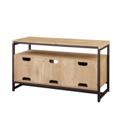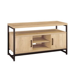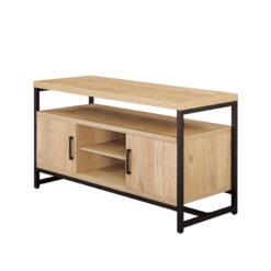 The rustic character of the natural oak finish complements the industrial style of the Better Homes and Gardens Jace Media Console’s metal frame. This console will be a great fit with a variety of home decor styles from rustic to transitional and everything in between. The console features a spacious top that can fit a flat panel television up to 55 inches. The cabinet and shelving options this console provides makes it a great multi-purpose storage solution whether it’s being used as a dining buffet, an accent table or an entertainment center. The top shelf is set up to be the ideal space for housing your audio/video components. There are two storage cabinets that include an adjustable shelf for flexible concealed storage along with an open center area for even more storage and display options. The back of the console features cable cutaways for conveniently organizing and managing cables and cords. Pair the console with the Better Homes & Gardens Jace 5-Tier Bookcase to create an enhanced entertainment center (sold separately).