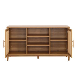 Standing on stylish tapered legs, this credenza TV stand, is the perfect addition to your entertainment collection. The old-world beauty of this TV stand with doors from the Better Homes & Gardens® Springwood collection is accentuated by decorative rattan inserts in each door. Behind each door is an adjustable shelf for storage of DVDs or other audio equipment. This TV credenza with doors also features open storage to display your favorite movie memorabilia. The mid-century modern style of this entertainment credenza makes it the perfect living room companion for a record player and your collection of vinyl records, as well. This TV cabinet with doors has a spacious top surface providing plenty of room for up to a 60” TV weighing 70 lbs. or less. This sophisticated and tropical-inspired credenza with a neutral, Light Honey finish gives even the smallest space a touch of Caribbean charm while blending seamlessly into any décor.