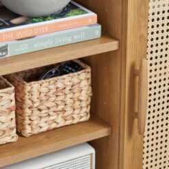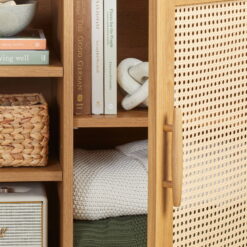 - Door fronts feature decorative rattan insert