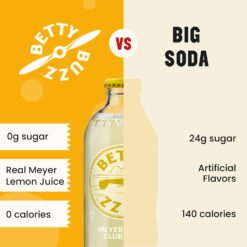 - Blake’s Homemade Recipe – Betty Buzz Meyer Lemon Club Soda is made with Meyer Lemon juice, a pinch of sea salt, natural flavors and zero artificial colors or sweeteners. Every sip of our premium sparkling soda has just the right amount of tiny bubbles for a unique, refreshing mouthfeel. 0 calories per 9oz bottle.